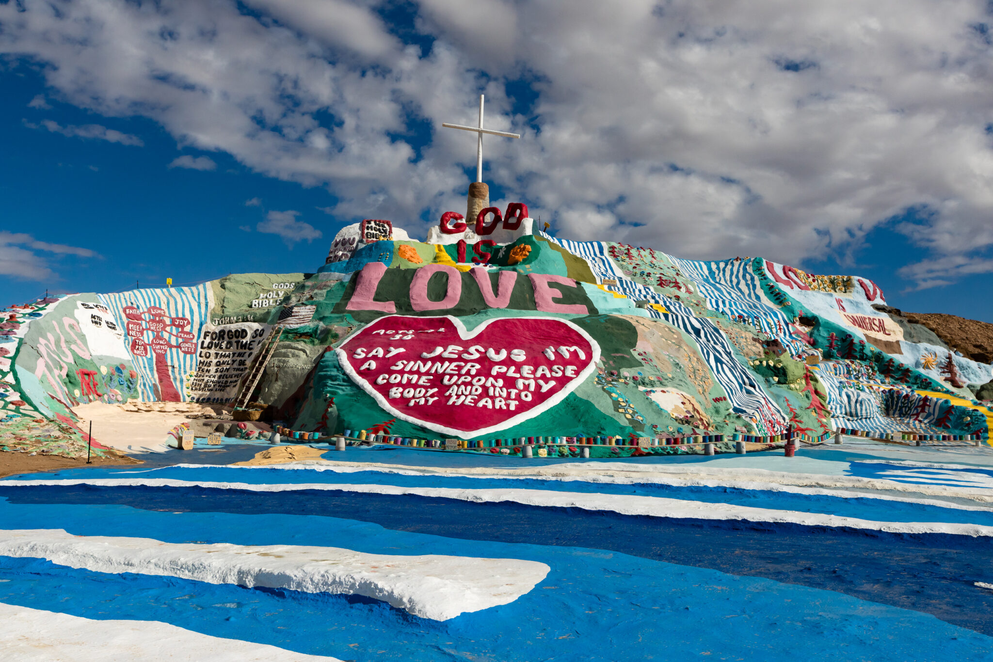 Leonard passed away in 2014, at age 83. A few years earlier he had been forced to leave Slab City because of health issues, triggering concern that the repair-needy Salvation Mountain would not survive without him. Despite reports of damage, when I visited the sculpture, it was in good condition with ongoing repair work and the chemical scent of fresh paint in the air. The Folk Art Society of America recognized Salvation Mountain in 2000 as a site worthy of protection. Salvation Mountain is looked after by a nonprofit organization, which is raising funds to buy the land on which it is built to secure its long-term survival. The desert is a harsh environment, and I hope there are people to care for the sculpture with a passion similar to the spirit that created the monument.